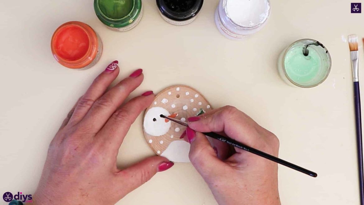 Utilisez votre pinceau pointu de taille moyenne pour transformer votre cercle blanc en tête de bonhomme de neige. Trempez-le dans la peinture orange et, du côté droit du cercle, créez une forme pointue qui sera un nez de carotte.