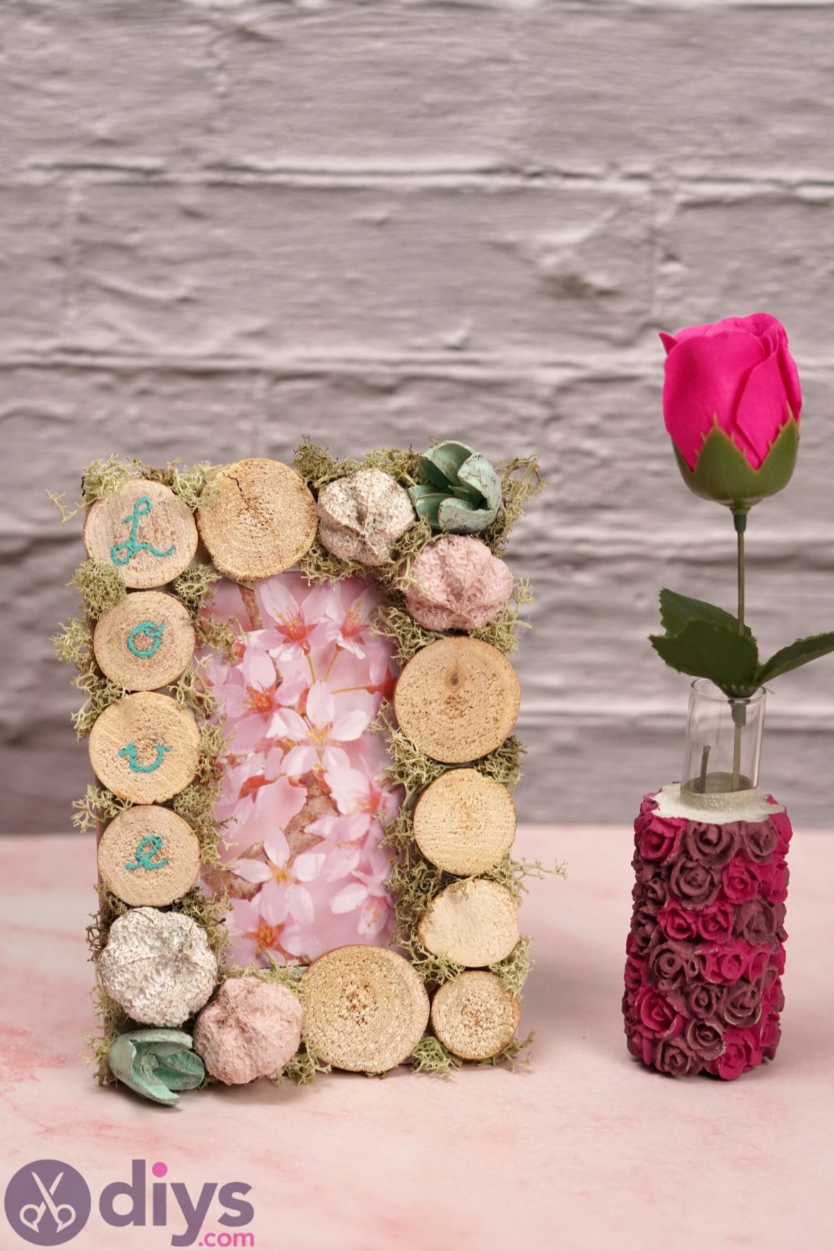 Maintenant que le cadre photo en carton est installé, vous voudrez prendre les tranches de bois avec les lettres peintes. Nous les avons ajoutés sur le côté gauche du cadre. Ensuite, nous sommes allés et avons arrangé l’autre tranches de bois et plantes sèches au cadre pour voir à quoi ils ressembleraient le mieux. Vous voulez que les lettres soient proches les unes des autres, mais vous avez libre cours sur la façon dont le reste des pièces sont disposées.