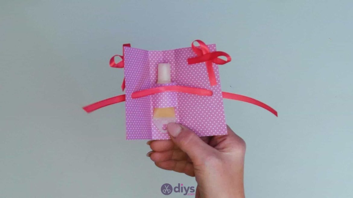 Faites glisser votre rouge à lèvres dans la fente à l'intérieur de la carte, fermez la carte et attachez-la avec les extrémités du ruban. Voila!