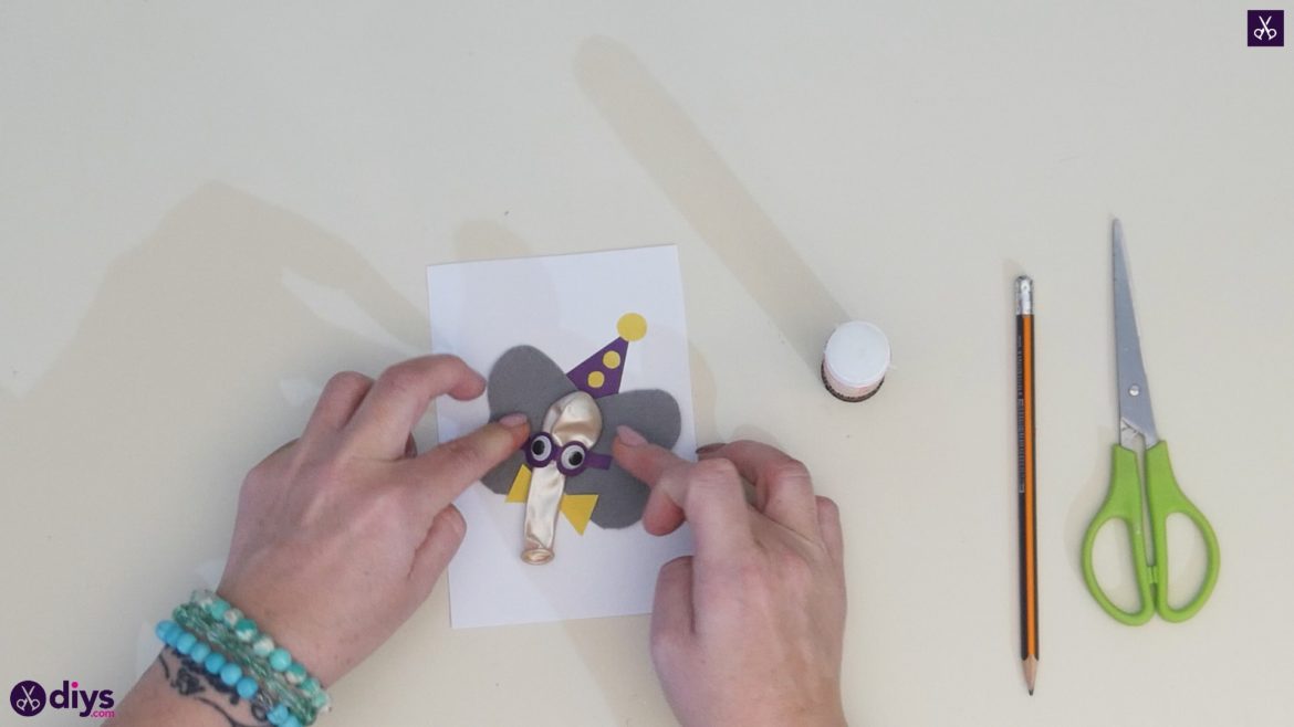 Appliquez de la colle à l'arrière de la pièce de lunettes de soleil violette sur laquelle vous avez collé vos yeux écarquillés avant et collez-les horizontalement juste à travers le ballon où le cercle se rétrécit dans la tige du ballon ou le «tronc» de l'éléphant.