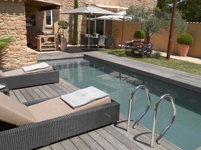 Une grande planche de bois, maintenue par deux équerres, fait office de bureau et leur version mini de bibliothèque de chaque côté d’un mur couleur ocre. Des tables en rondin de bois, un tabouret marocain, un tapis bohème et un chapeau de paille donnent à cet espace des envies de voyages.