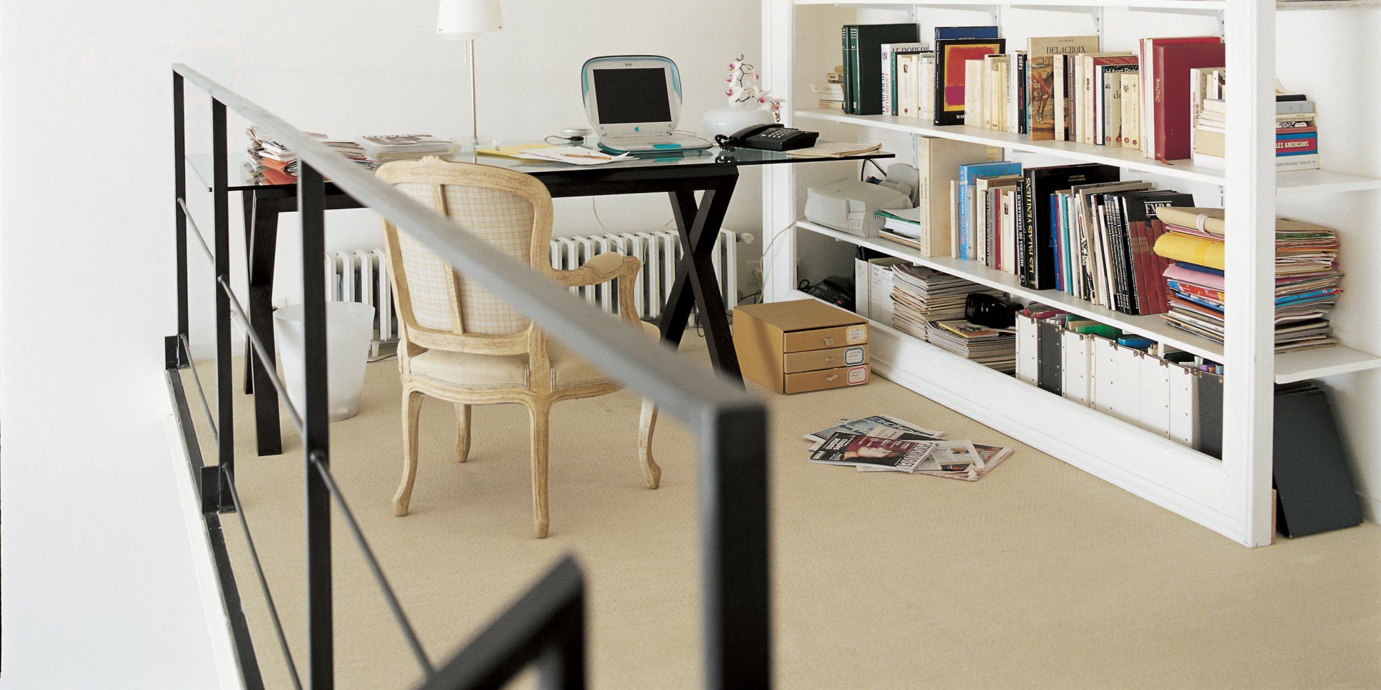 Quel meuble mettre sur un palier ? Les étagères murales interviennent plutôt sur des paliers restreints qu’il faut éviter d’étouffer avec des aménagements pleins. Un coin bureau s’est glissé dans un renfoncement du mur pour optimiser tous les mètres carrés.