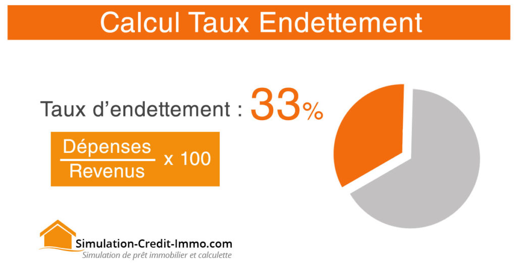 Le calcul est le suivant : (total des crédits x 100) / total des revenus = taux d’endettement. Exemple : Vous êtes en couple, votre conjoint gagne 1000 € nets et vous aussi. Vous avez une mensualité pour la voiture de 200 €, une mensualité pour le lave-linge de 50 € et une mensualité de 400 € pour la maison.