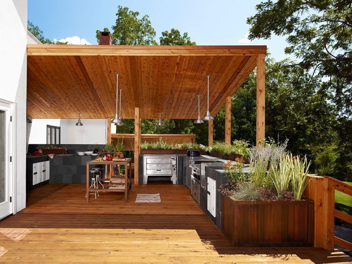 En termes de matériaux, le bois, la pierre neuve ou ancienne, la brique ou l’inox, tout est possible à condition que le matériau puisse supporter les intempéries. Installer une pergola ou faire construire une terrasse couverte peut être une bonne solution pour mettre à l’abri votre cuisine d’été.