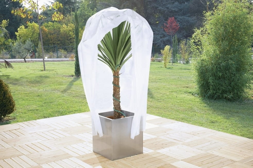 Enrubannez-le dans plusieurs épaisseurs de voile d’hivernage, comme si vous enfiliez une écharpe en plusieurs couches. Si un coup de froid sévère est prévu, renforcez cette protection en plaçant des branches de conifère dans le cœur des palmes.