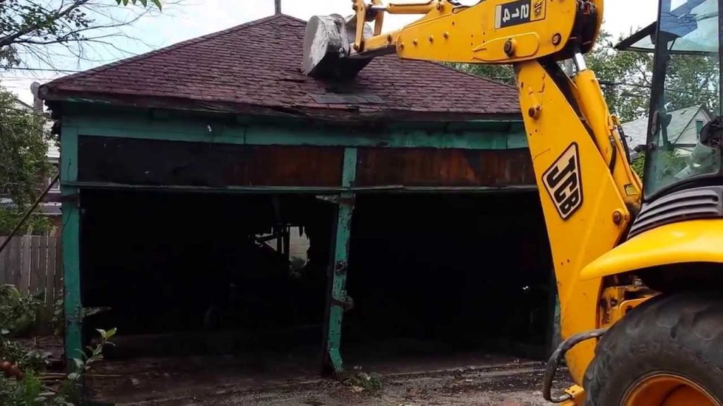 Avant de démolir votre garage, pensez avant tout à retirer le toit. Coupez l’écart dans les sections avec la scie sauteuse, et utilisez une combinaison de levier, un marteau et perceuse à percussion à se détacher des sections de la toiture afin d’exposer les murs en dessous.