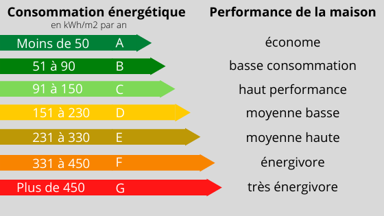 Exemple : Une maison de 100 m2 consomme 17000 Kwh par m2 par an. Divisons simplement 17000 par 100, la note de consommation du logement sera de 170 kWh. Soit un classement en D (La note D est la plus représentée en France).