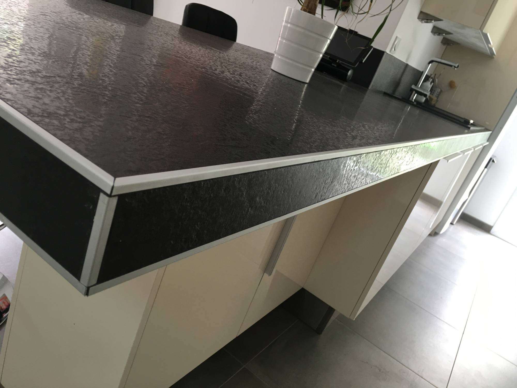 Il faut lever le plan de travail à la verticale pour le déposer toujours à la verticale sur les meubles en leur milieu. Ensuite il faut basculer le plan de travail délicatement en le soutenant en plusieurs endroits (au moins deux personnes) et le faire glisser à plat sur les meubles jusqu’au mur.