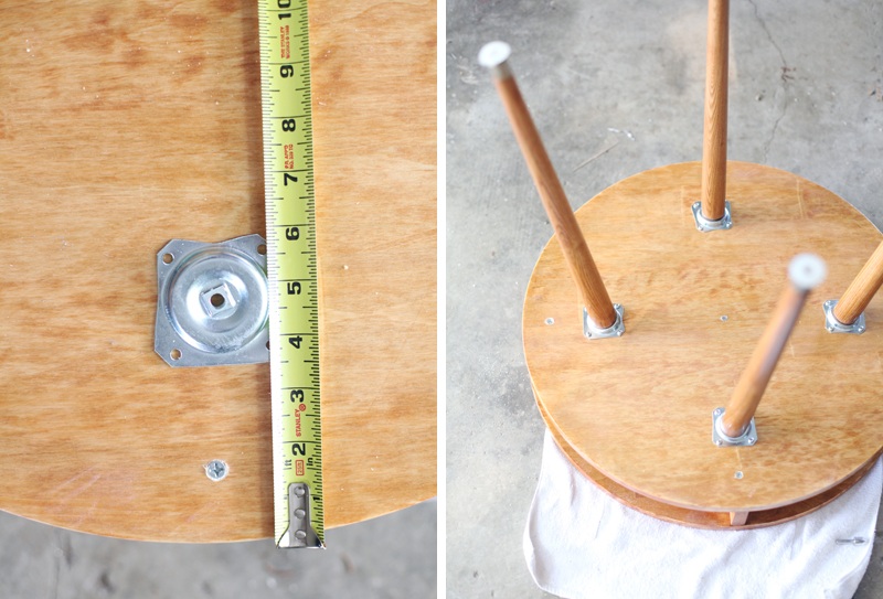Une fois les trous percés (prenez bien soin de mesurer l’endroit pour que les pieds soient fixés aux mêmes endroits dans chaque coin de votre meuble, on a choisi de les fixer à 6,5*7,5cm dans chaque coin pour que cela soit harmonieux), il vous suffit de placer les plaques de montage de telle sorte à ce que le trou …