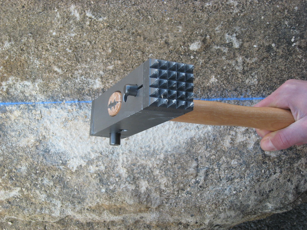 Pour ne pas risquer d’éclater la pierre au-delà des limites repérées au départ, enfoncer quelques ciseaux à brique comme des coins dans les traits de coupe. Puis casser l’angle directement à la massette. Terminer l’ouverture au burineur et à la pointerolle en attaquant les pierres près de leur face supérieure.