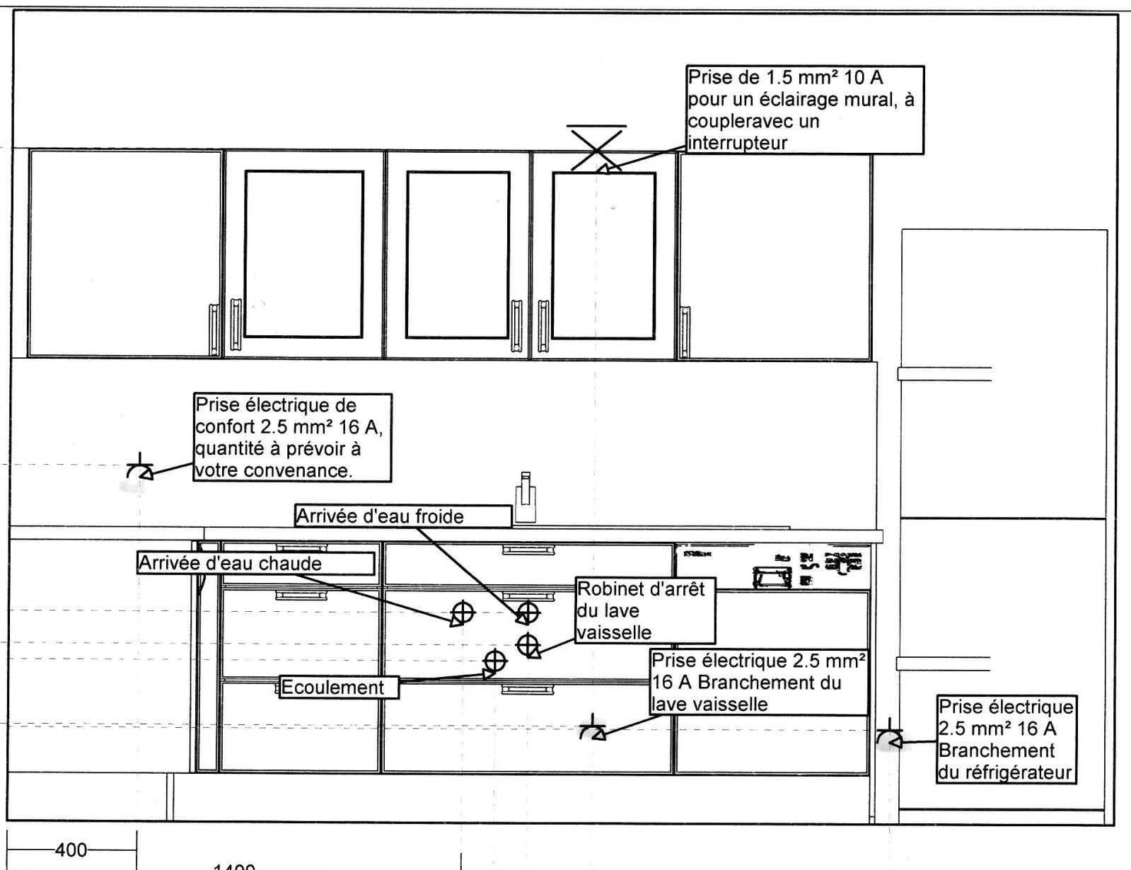 Tous les interrupteurs de la pièce doivent se situer entre 90 cm et 1m80 du sol. Tous les interrupteurs doivent être placés à l’entrée de la cuisine.