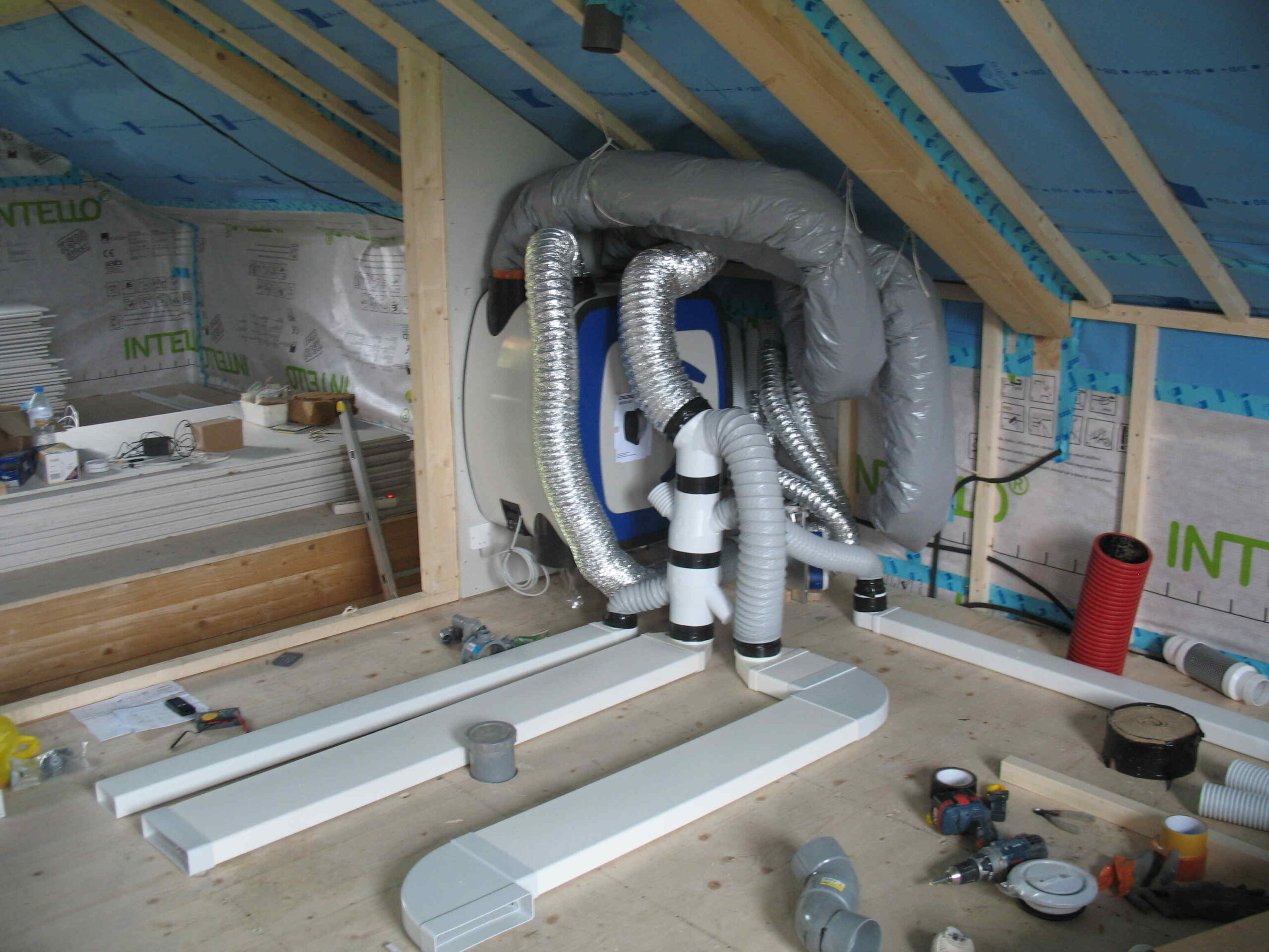 Installation. La VMI Ventilairsec est installée dans les combles, où l’air entrant est pris directement à travers une chaussette filtrante. Cela n’est pas recommandé, il faut mieux prendre l’air entrant à l’extérieur via une gaine.