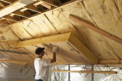 Pour isoler un plafond, une épaisseur de laine de verre en rouleaux de 120 cm est préconisée si une pièce à vivre est présente au-dessus. Elle garantit une bonne isolation thermique mais aussi acoustique.