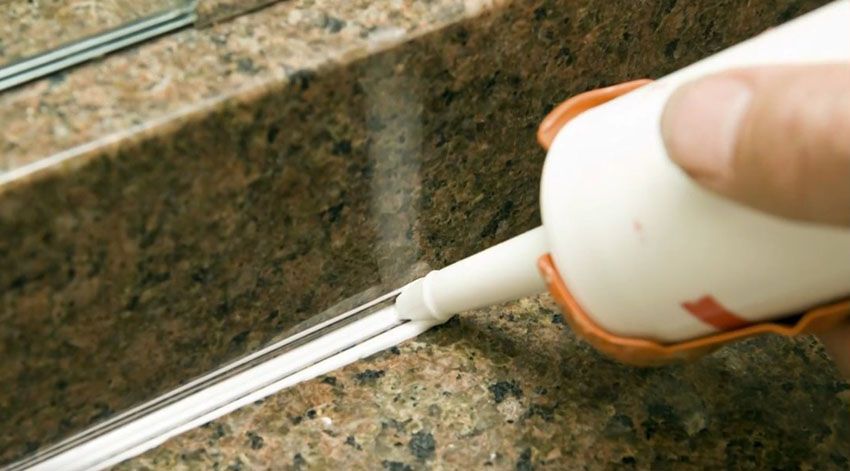 Les plans de travail en Corian® sans baguettes de soutien sont montés directement sur le corps de placard. La fixation se fait dans une silicone élastique. De part et d’autre, sur tous les côtés du corps de placard et sur les baguettes d’encadrement, le plan est fixé dans des gouttes de silicone de la taille d’un pois.