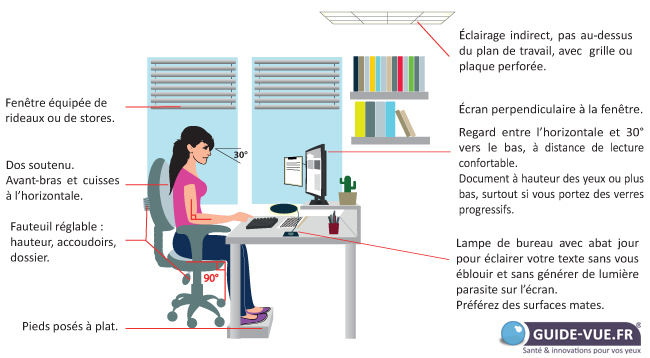 Installer de préférence le bureau dans une pièce orientée au nord : la luminosité y est plus constante. Positionner le bureau et donc l’écran d’ordinateur en fonction de la fenêtre. Celle-ci ne doit pas se situer derrière pour éviter qu’un reflet gênant n’apparaisse.