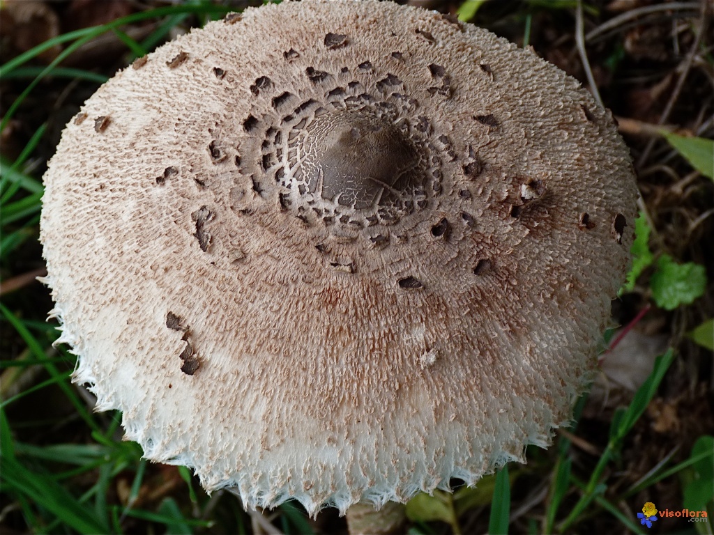 Fond blanc à crème, circulairement orné de méchules ou écailles grises/beiges à brunâtre. Lames : serrées, blanches à crèmes, puis jaunâtres à maturité. Pied : fibreux 18/40cm bulbeux à la base. Chiné en zig zag (couleurs juxtaposées) brun sur crème.