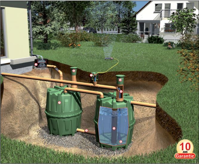Un filtre auto-nettoyant évite que les feuilles et autres déchets ne se faufilent dans le réservoir. Par la suite, une pompe aspire l’eau de pluie vers le robinet de jardin, les toilettes ou la machine à laver.