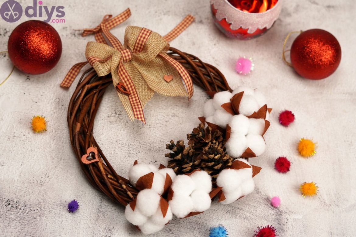 Comme vous pouvez le voir, notre base de couronne est faite de brindilles, mais si vous avez une base différente, cela fonctionnera aussi. Bien sûr, nous adorons la façon dont les éléments naturels fonctionnent ensemble ici, se mélangeant dans la couronne de brindilles avec les pommes de pin et ce qui semblera être des fleurs de coton.