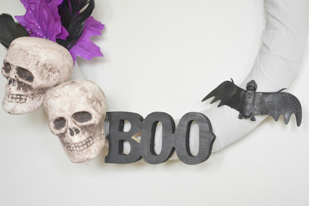 Collez les pièces d’accent vers le bas avec une colle résistante. La colle E-6000 ou Gorilla fonctionne bien. J’ai placé les lettres «Boo» au bas de la couronne comme accent principal.
