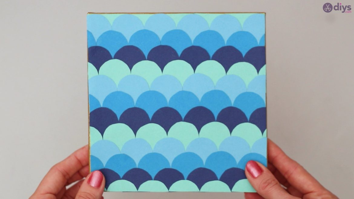 Votre produit fini doit ressembler à des écailles de poisson dans la mesure où elles se chevauchent. Avec les tons bleus, il peut aussi ressembler à l’océan d’une manière abstraite. De toute façon, c’est une belle pièce.