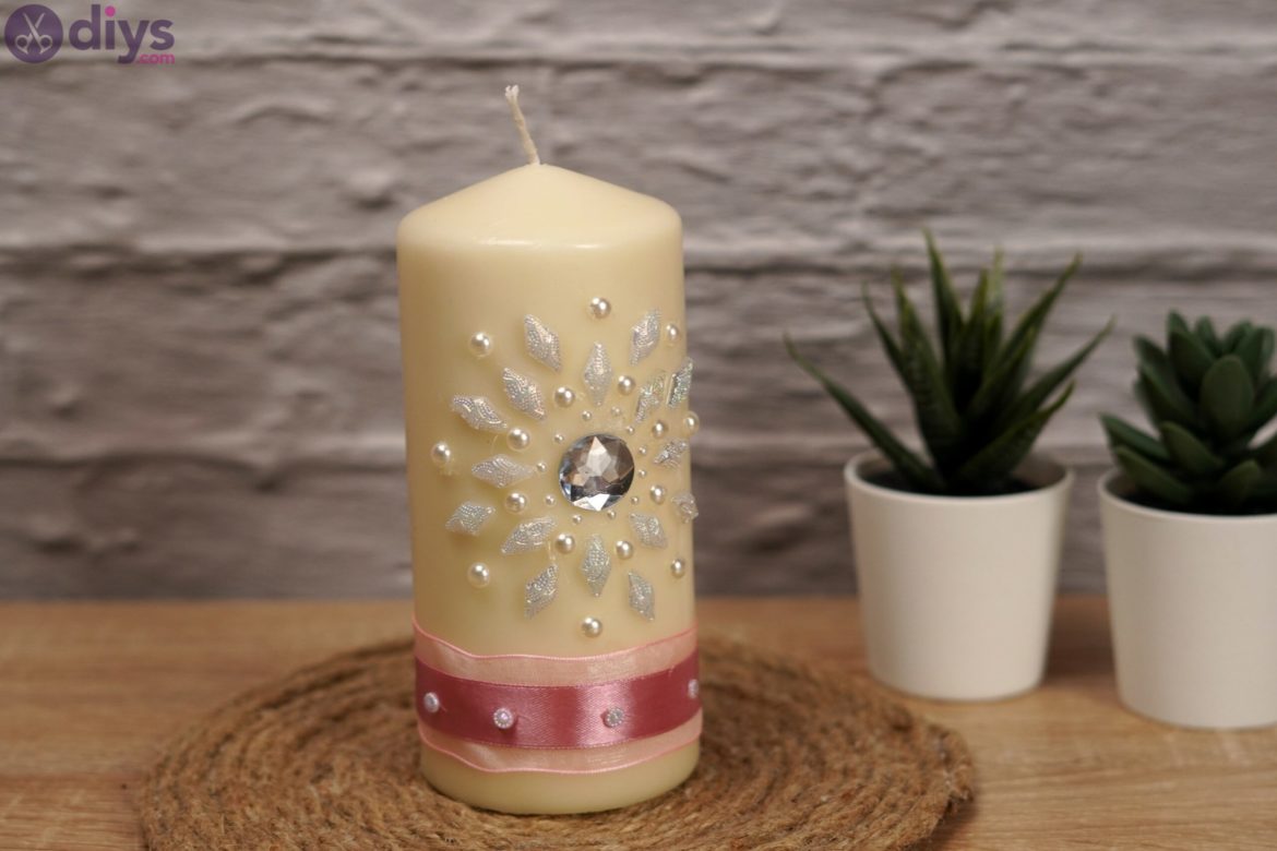 Ensuite, attrapez les strass en forme de diamant, appliquez de la colle chaude sur leur dos et appliquez-les sur la bougie. Nous avons appliqué 8 d’entre eux, marquant les points cardinaux si vous voulez, puis les points intermédiaires.