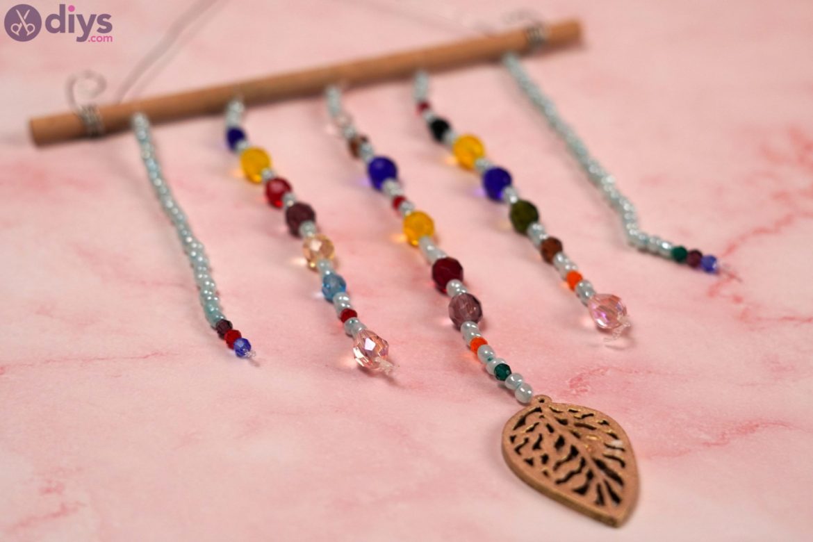 Assurez-vous de les organiser correctement. Les deux avec juste quelques perles colorées vont aux extrémités, les plus longues à l’intérieur et celle avec la feuille de bois va au milieu.