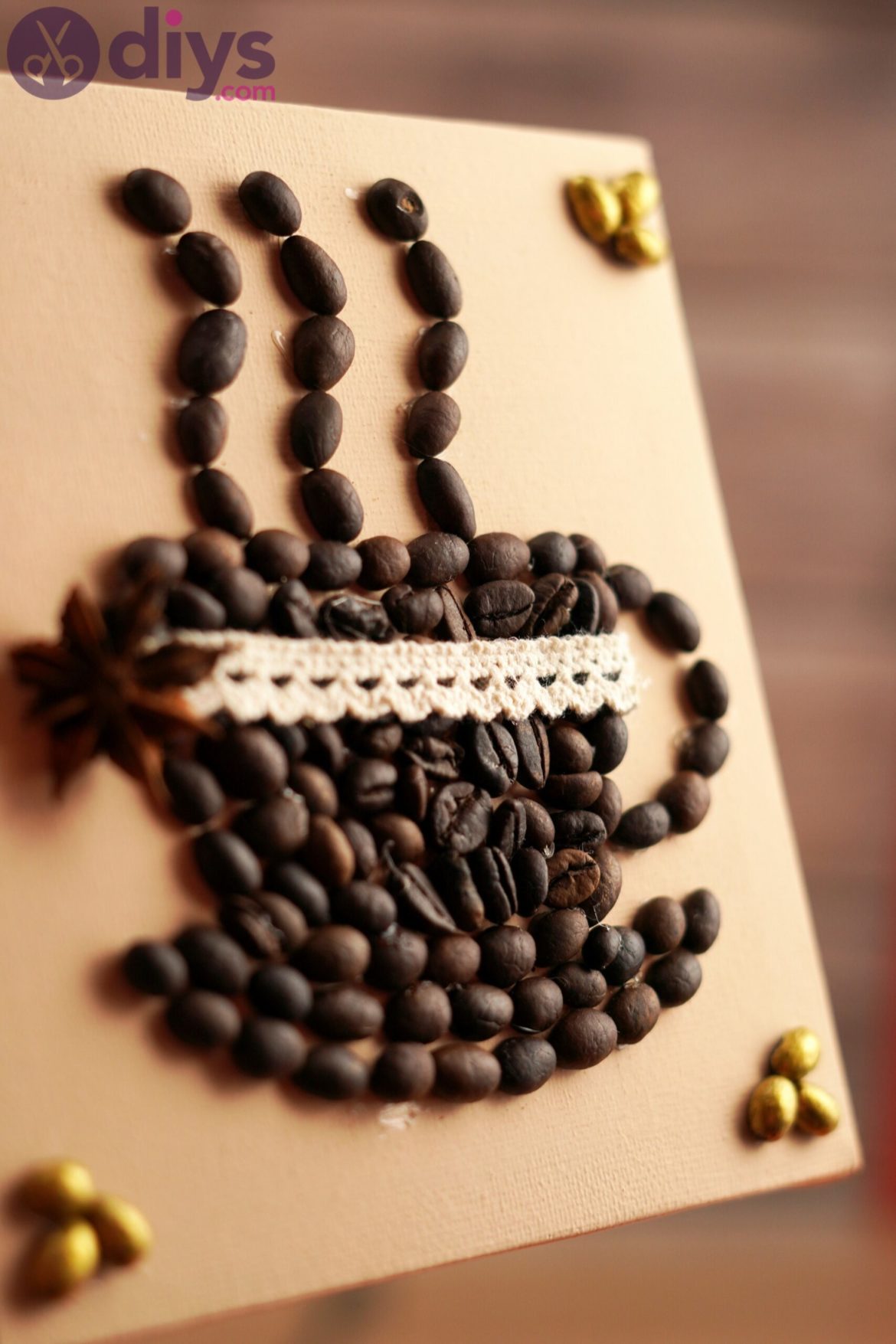 C’est tout! Nous avons maintenant une jolie pièce de décoration pour nos murs. Cela va vous rappeler de boire votre café tous les jours (si, pour une raison quelconque, vous avez oublié cette étape essentielle), et d’avoir l’air très bien aussi. Comme mentionné, il s’agit d’un métier que vous pouvez personnaliser comme vous le souhaitez, en modifiant la forme et la taille de la toile, en choisissant une couleur d’arrière-plan différente pour la peinture et même en créant un design différent à partir des grains de café.