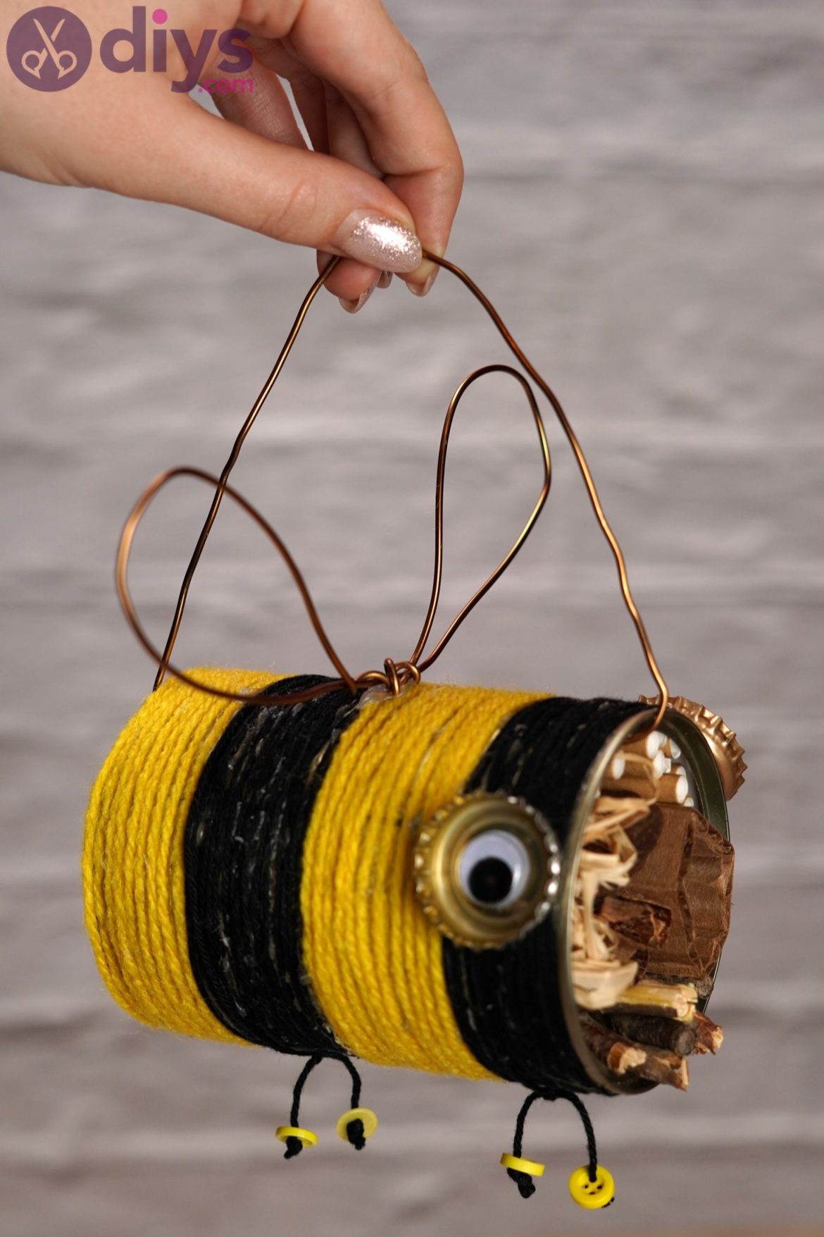 Ensuite, une fois que les yeux écarquillés sont fixés sur les bouchons de bouteilles en métal, récupérez le pistolet à colle une fois de plus et ajoutez de la colle chaude à l’arrière du dos et placez-le sur l’un des côtés de l’abeille. Assurez-vous de soulever la boîte de conserve par le fil de suspension pour détecter la ligne médiane de cette création, et vous savez où placer les «yeux».