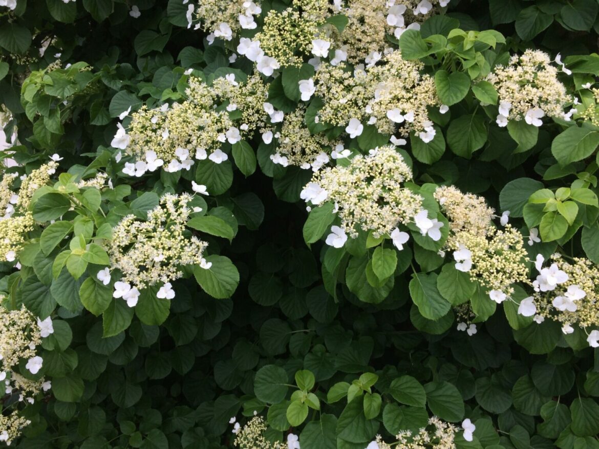 Le plus connu des Hydrangea grimpants est le petiolaris, il s’accroche aux murs ou aux arbres grâce à ses racines aériennes Ses inflorescences sont moins spectaculaires, des fleurs stériles se posent comme des plumes légères ou des papillons sur les fleurs fertiles Son feuillage est couleur d’or à l’automne