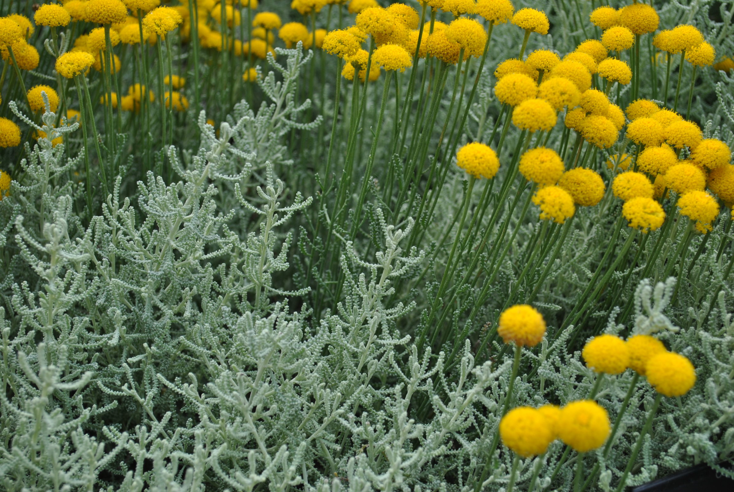 - Santoline grise ou petit cyprès De juin à août, la plante se couvre de petites fleurs jaunes groupées en capitules