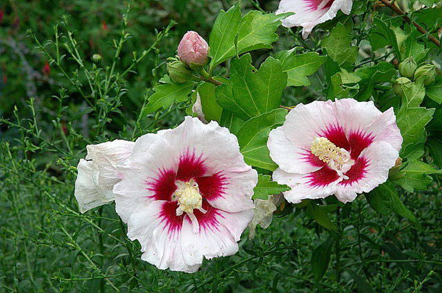 Les fleurs apparaissent à l’aisselle des feuilles, sur les pousses de l’année, et s’épanouissent généralement de juillet à septembre Mauve au cœur marqué de rouge à l’origine, les fleurs possède cette forme caractéristique et exotique avec leur pistil jaune proéminent