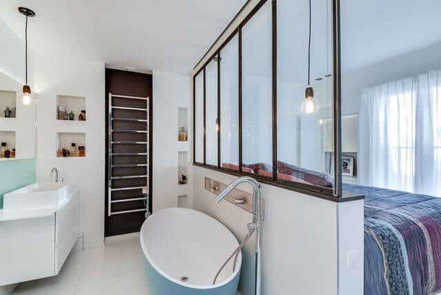 Lorsque vous faites aménager la salle de bains, la cuvette des toilettes doit être éloignée du lavabo (ou de la vasque), de la baignoire et/ou de la douche, voire séparée physiquement si la surface vous le permet. C’est une question d’hygiène, mais aussi d’intimité si vous êtes plusieurs à partager cette pièce.