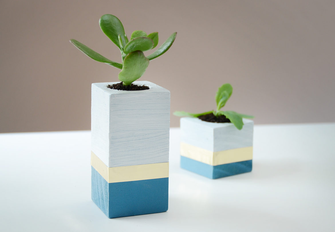 Mes blocs ont commencé en bleu, j’ai donc décidé de peindre les deux tiers supérieurs en blanc pour leur donner un aspect de couleur bloquée. Le bord de la peinture ne doit pas être parfaitement droit car il sera recouvert par le ruban adhésif. Laissez la peinture sécher complètement et ajoutez une deuxième couche si vous préférez.