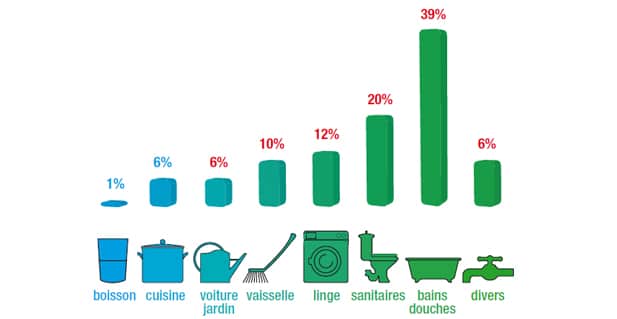 Selon le relevé des compteurs d’eau en général, un foyer de 4 personnes, composé de 2 adultes et de 2 enfants consommerait en moyenne 150 m3 d’eau par an (55m3 par adulte et 20m3 par enfant), ce qui équivaut à 410 litres par jour.