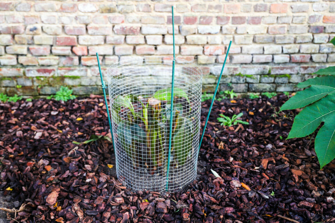 Remplissez l’intérieur de feuilles mortes, de fougères ou de paille Recouvrez le grillage avec un voile d’hivernage qui laisse l’air passer et fixez sur le dessus un morceau de bâche plastique pour ne pas que l’eau rentre à l’intérieur ce qui risquerait de faire pourrir le bananier