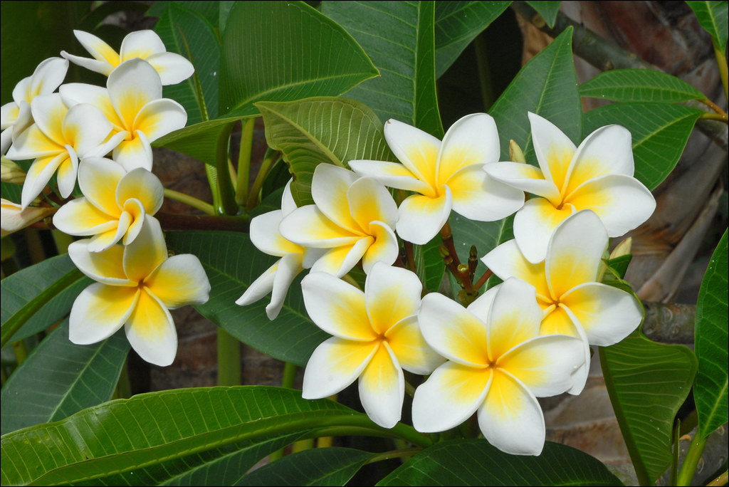 Comment s’appelle la fleur du frangipanier ? Plumeria acuminata, aux fleurs blanches à centre jaune, les plus parfumées Plumeria alba, aux fleurs blanches et jaune au centre