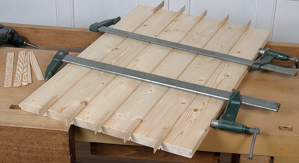Les volets se mettent en place, séparés au niveau du couvre-joint par une cale de 6 mm d’épaisseur nécessaire à la préservation d’un jeu évitant les frottements (le bois gonfle sous l’effet de l’humidité). Réparties en périphérie des volets, des cales biseautées ménagent également un jeu constant.