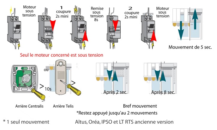 Pour ce faire, il vous faut débrancher les deux fils de montée et descente (noir et marron) du moteur. Ensuite, en étant sous tension, prenez garde, vous faîtes contact entre la phase (généralement fil de couleur rouge) et l’un des fils (noir ou marron) que vous venez de débrancher.