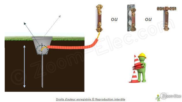 La section du conducteur de terre doit être au moins de : 16 mm² en cuivre isolé ; 25 mm² en cuivre nu ; 50 mm² acier galvanisé non protégé contre la corrosion.