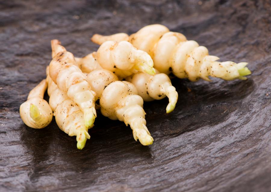 Le crosne du Japon (Stachys affinis, famille des Lamiacées) est une plante vivace qui nous vient de Chine ! Introduit au Japon, il est arrivé en Europe seulement à la fin du 19e siècle
