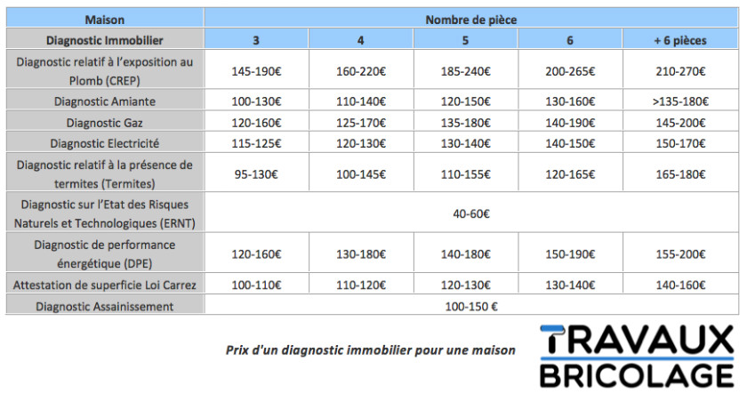 Le diagnostic plomb varie entre 90 € pour un studio ou appartement F1 à 300 € pour une grande maison. Pour le diagnostic termites, la fourchette est de 70 € à 200 €. Faire diagnostiquer les installations électriques revient de 60 € à 110 € pour un studio et peut varier de 135 € à 180 € dans le cas d‘un cinq pièces.