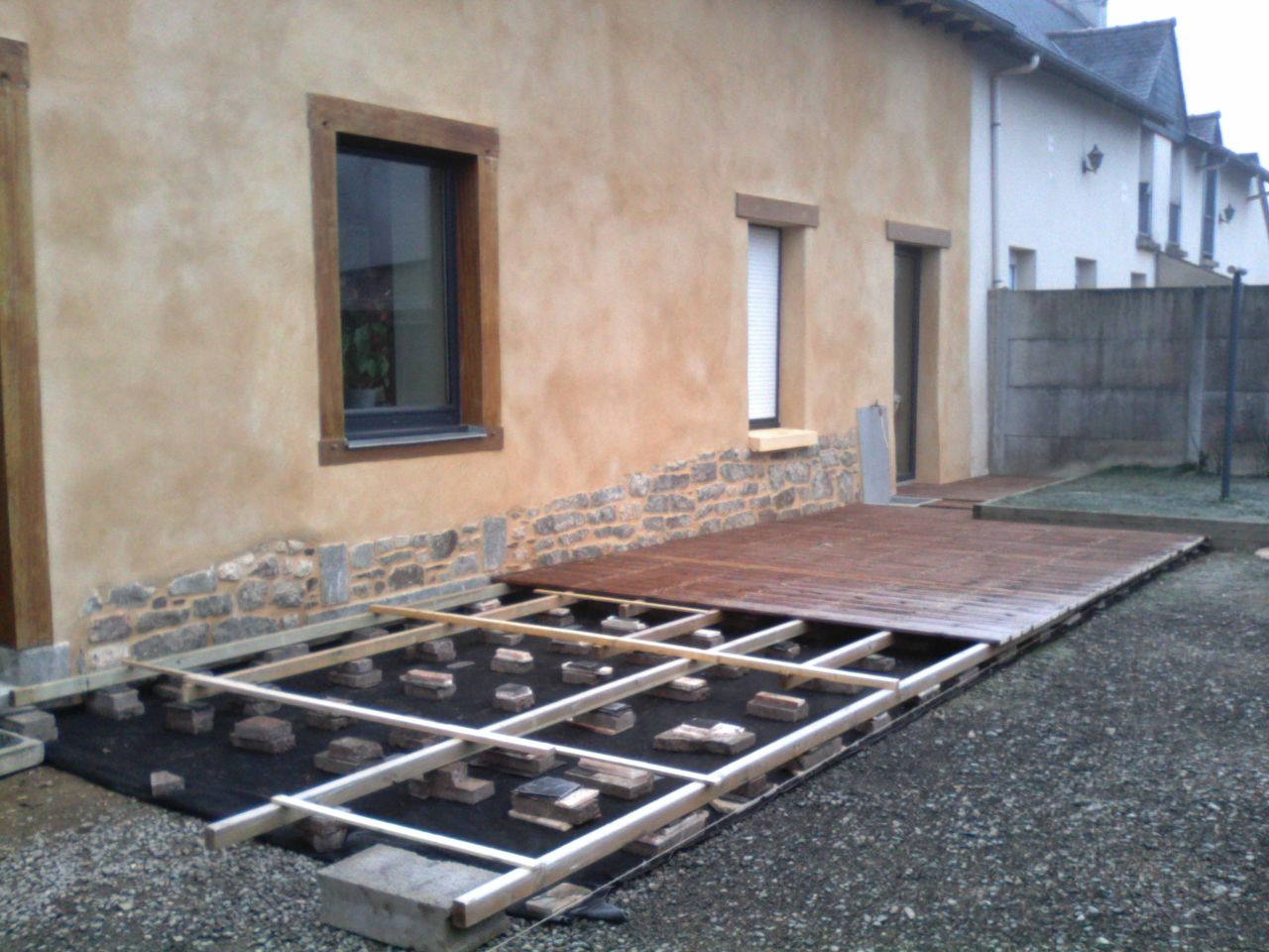 Si le sol est nu, bien tassé, il est recommandé d’installer des bandes de géotextiles sur 5 cm d’épaisseur afin d’empêcher la pousse des mauvaises herbes et de les voir apparaître entre les lames. En cas de sol en terre battue ou fraîchement installée, il faut prendre des précautions car la terrasse risque de bouger.