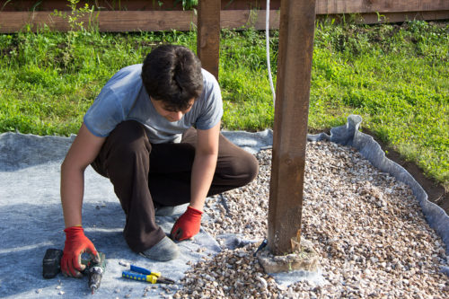 Prenez bien soin de faire se chevaucher les lés d’environ 20 cm. Maintenez le géotextile provisoirement avec quelques pelletées de gravier. Déposez le gravier sur le feutre géotextile en répartissant des tas sur la surface. Étalez le gravier sommairement à la pelle ou à l’aide d’un râteau tête retournée.