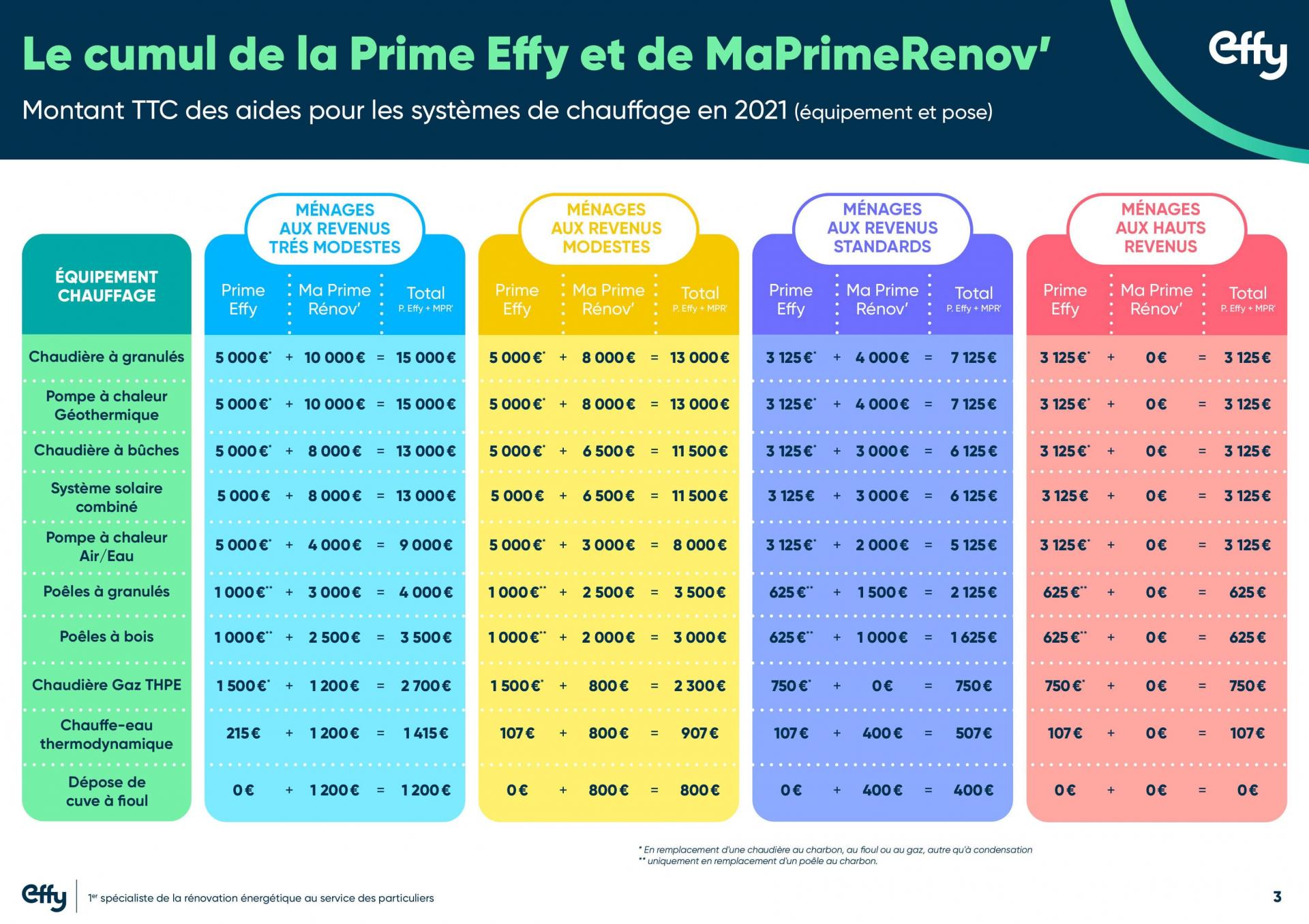Le cumul de la prime énergie est possible avec MaPrimeRénov’, l’éco PTZ et la TVA à taux réduit. Vous pouvez bénéficier de plusieurs primes énergie pour différents travaux. Cependant, un même projet ne peut pas bénéficier du cumul de plusieurs primes énergie.
