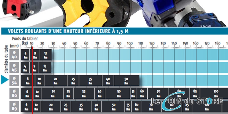 Comment calculer la puissance d’un moteur de volet roulant ? Une règle rapide est de diviser par 2 le poids du tablier pour obtenir la puissance en Newton/Mètre. 23.5 / 2 environ 12Nm. Ne vous contentez pas de ce simple calcul. Reprise exemple : nous avons un tablier de 23.4kg, nous avons un diamètre tube d’enroulement courant de 54mm.