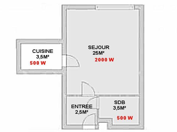 | Moins de 10 m 2 | 25 m 3 | 750 W |