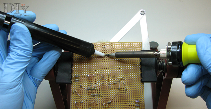 - Mettre l’ étain à la fois sur la patte du composant, la pastille et la pointe du fer à souder . La soudure se fait .