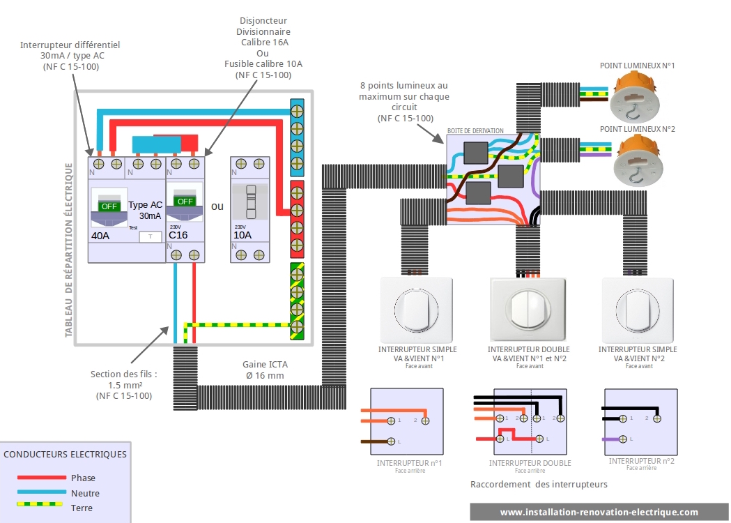 Pour reconnaître ces fils, il existe des normes qui définissent des codes couleurs à respecter. Le fil bleu correspond au neutre (N) ; Le fil rouge (noir ou marron) correspond au fil de phase (L) ; Le fil vert et jaune correspond au fil de terre.