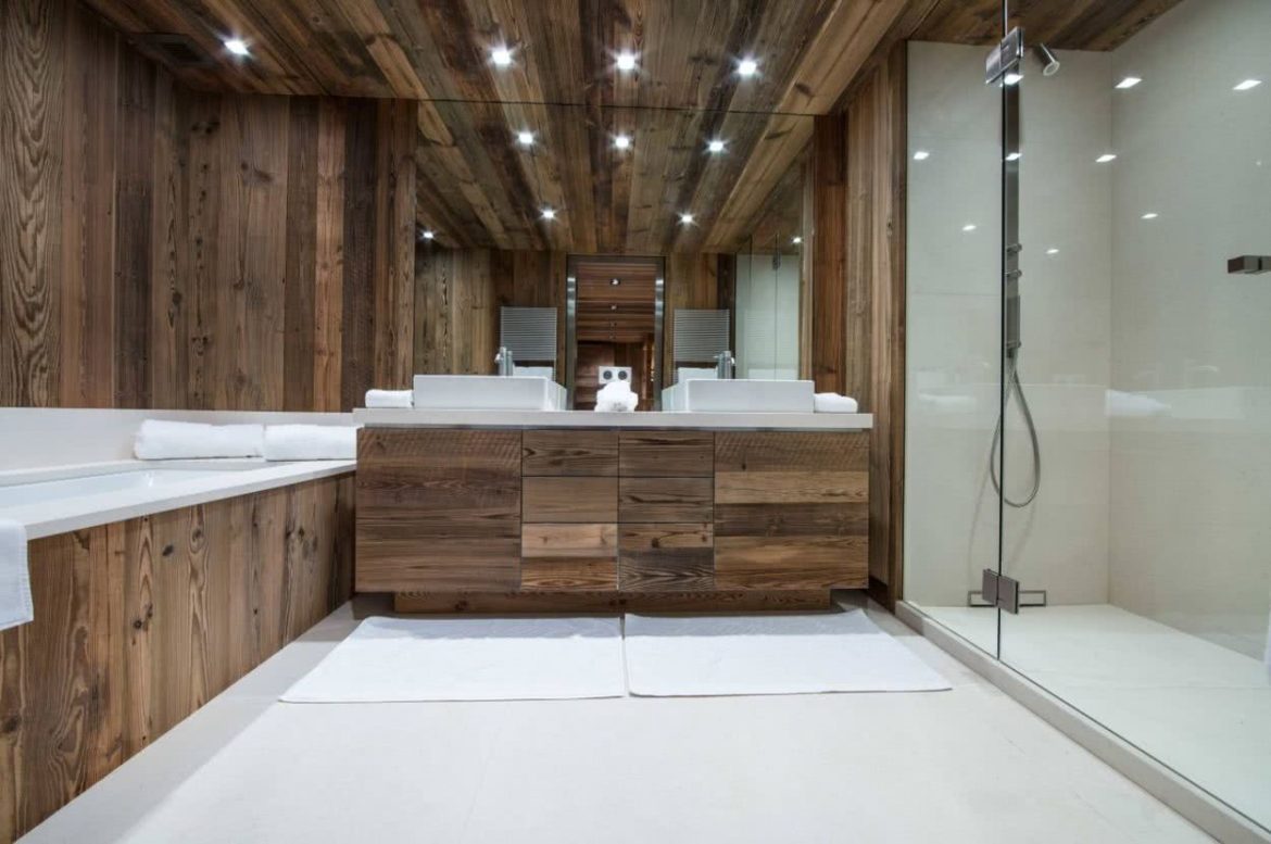 Pour réaliser parfaitement ce style dans votre salle de bain, vous pouvez opter pour des éléments décoratifs modernes et élégants (comme des baignoires majestueuses ou des miroirs sophistiqués), tout en laissant le rustique pour des détails spécifiques, par exemple, les meubles sous le comptoir.