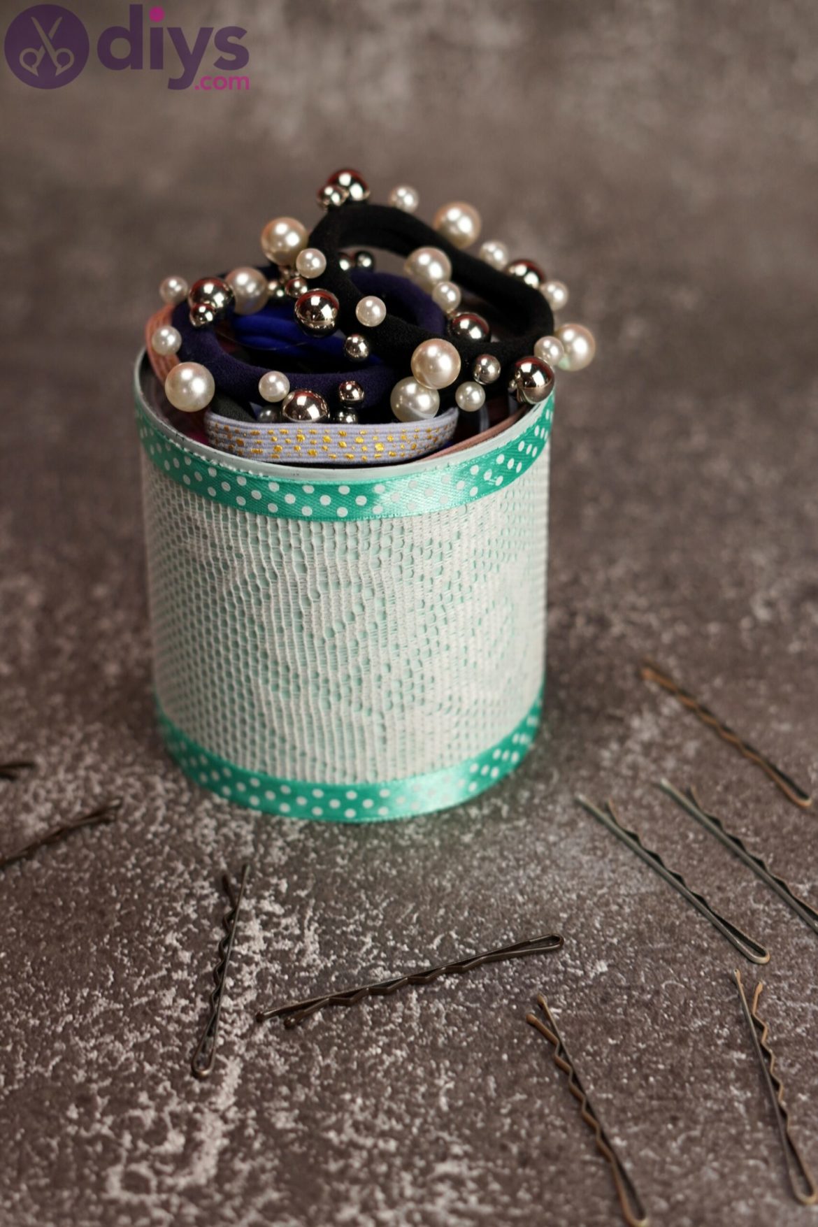 Et on y va! Vous avez maintenant un conteneur supplémentaire pour tout ce que vous voulez! C’est joli et il sera certainement meilleur sur votre bureau ou votre vanité qu’une boîte de conserve ordinaire! Vous pouvez évidemment le personnaliser comme bon vous semble, mais assurez-vous de choisir des nuances de la même couleur pour la peinture et le ruban de soie que vous appliquez en haut et en bas.